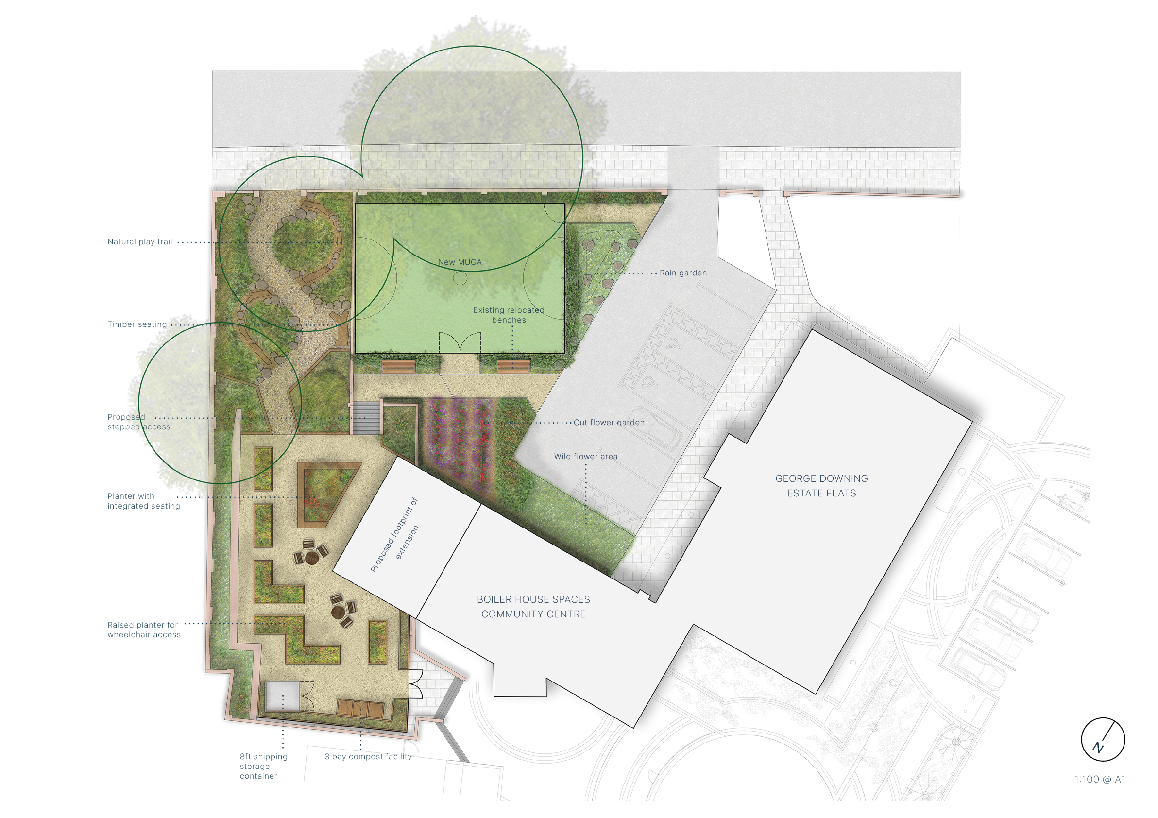 The garden brings together a forest garden, a shared growing area and generous spill out space from the new community building. It also includes a new multi purpose sports area set within a rain garden that promotes sustainable drainage.